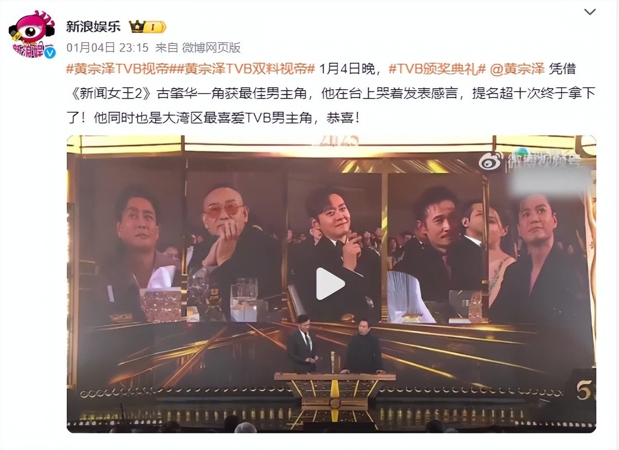 资料参考:新浪娱乐|#黄宗泽TVB视帝##黄宗泽TVB双料视帝#中新网|胡杏儿郑嘉颖夺无线"视帝视后"